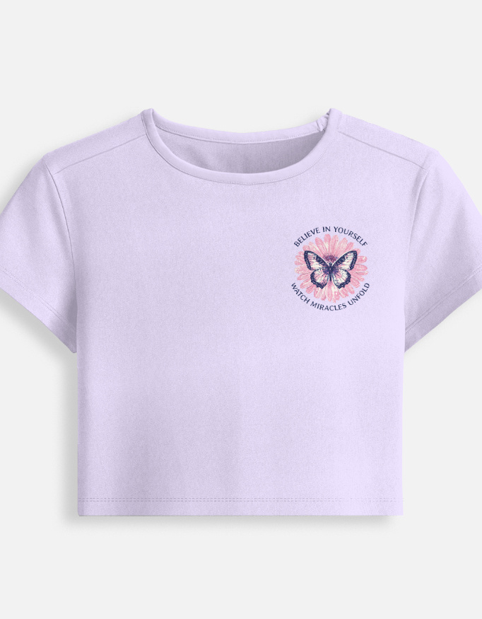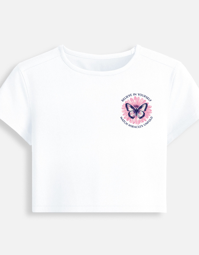 Step up your everyday essentials with the Believe In Yourself Baby Tee. Crafted from a premium 240 GSM cotton-spandex blend, this tee delivers a soft, stretchy feel with a flattering, close-to-body fit. The bio-wash treatment enhances comfort and helps the fabric hold up wear after wear. Finished with a cropped silhouette, it styles easily with denim, skirts, or cargos for a clean, street-inspired look that feels effortless and confident.